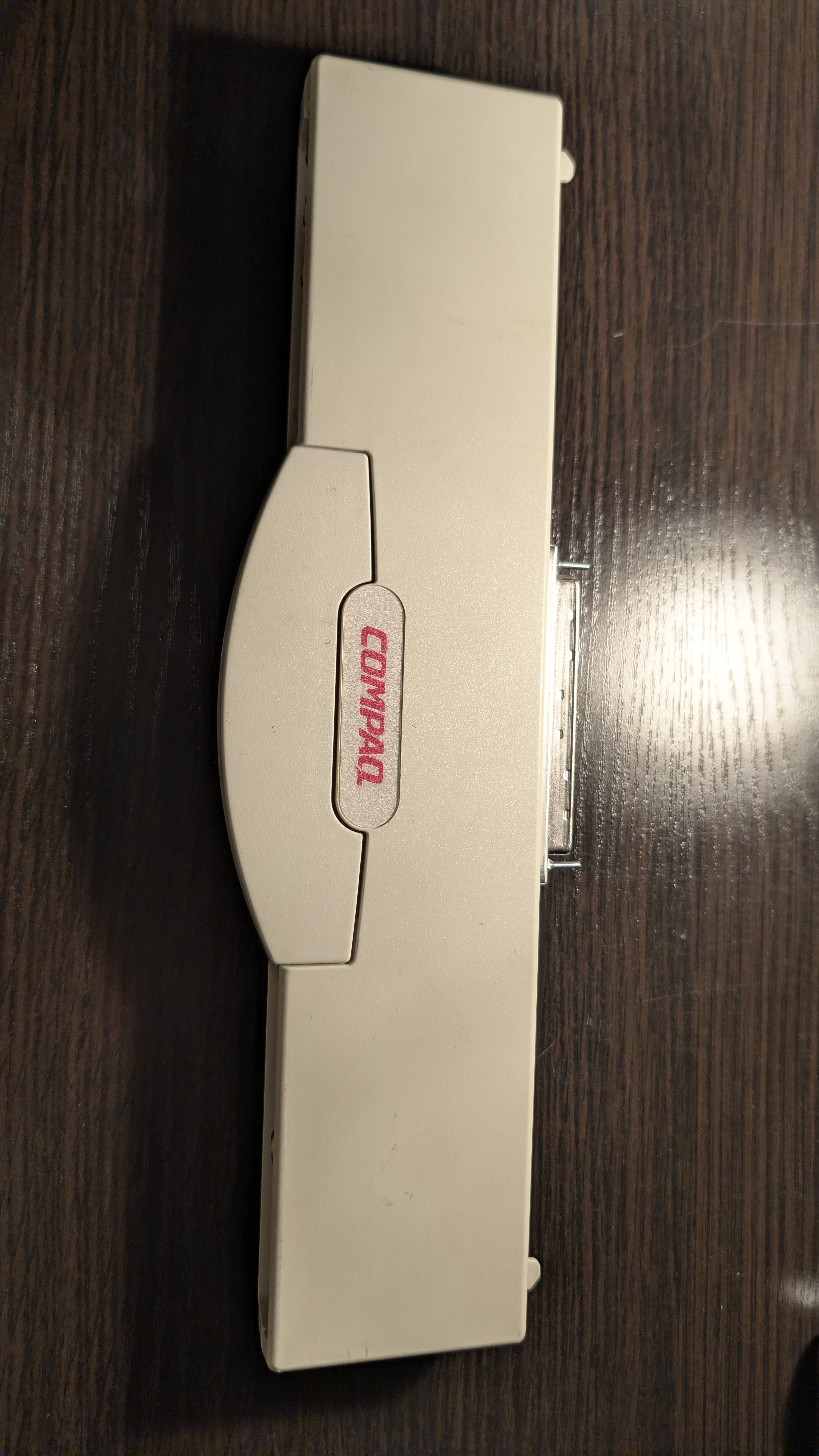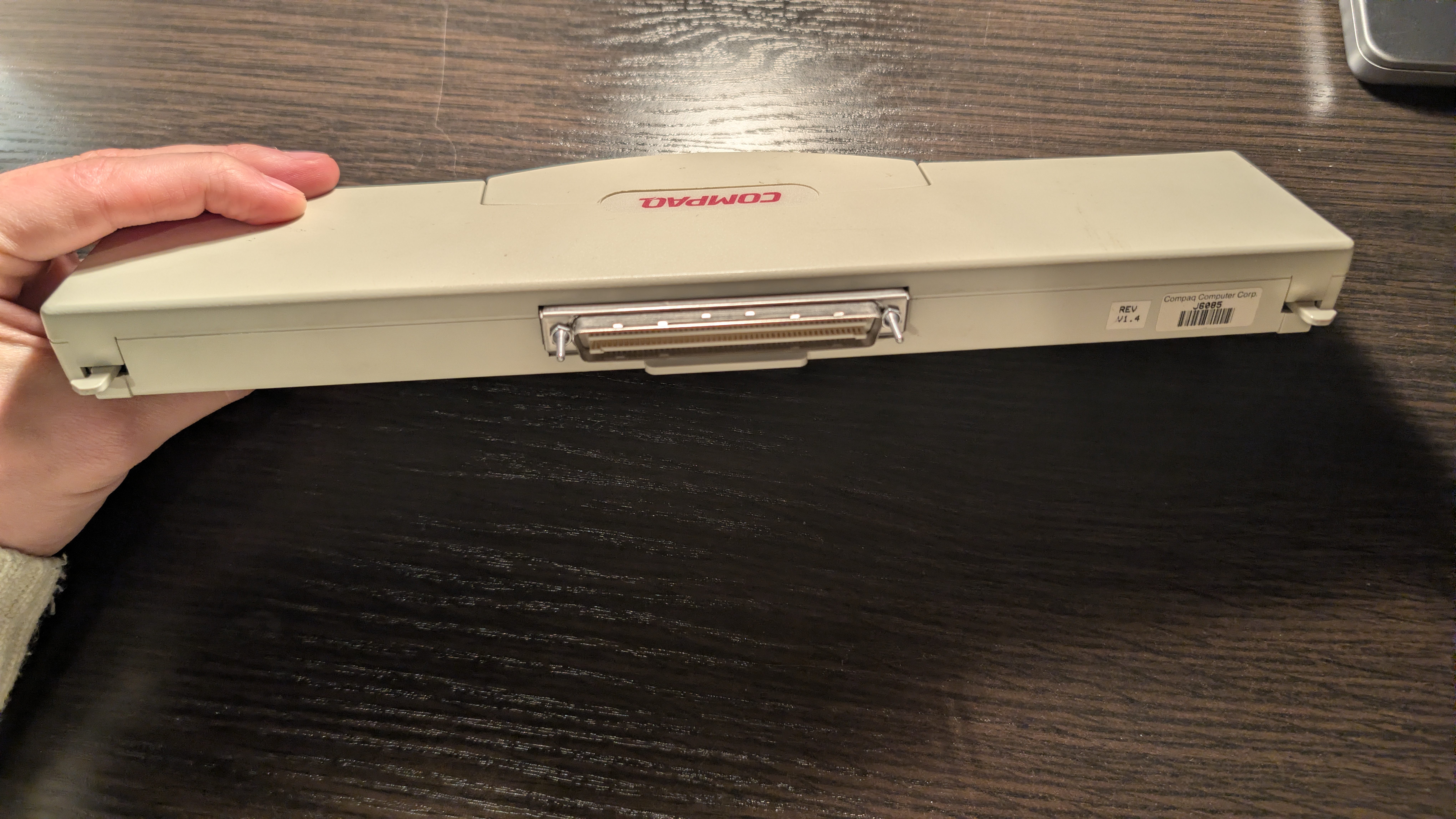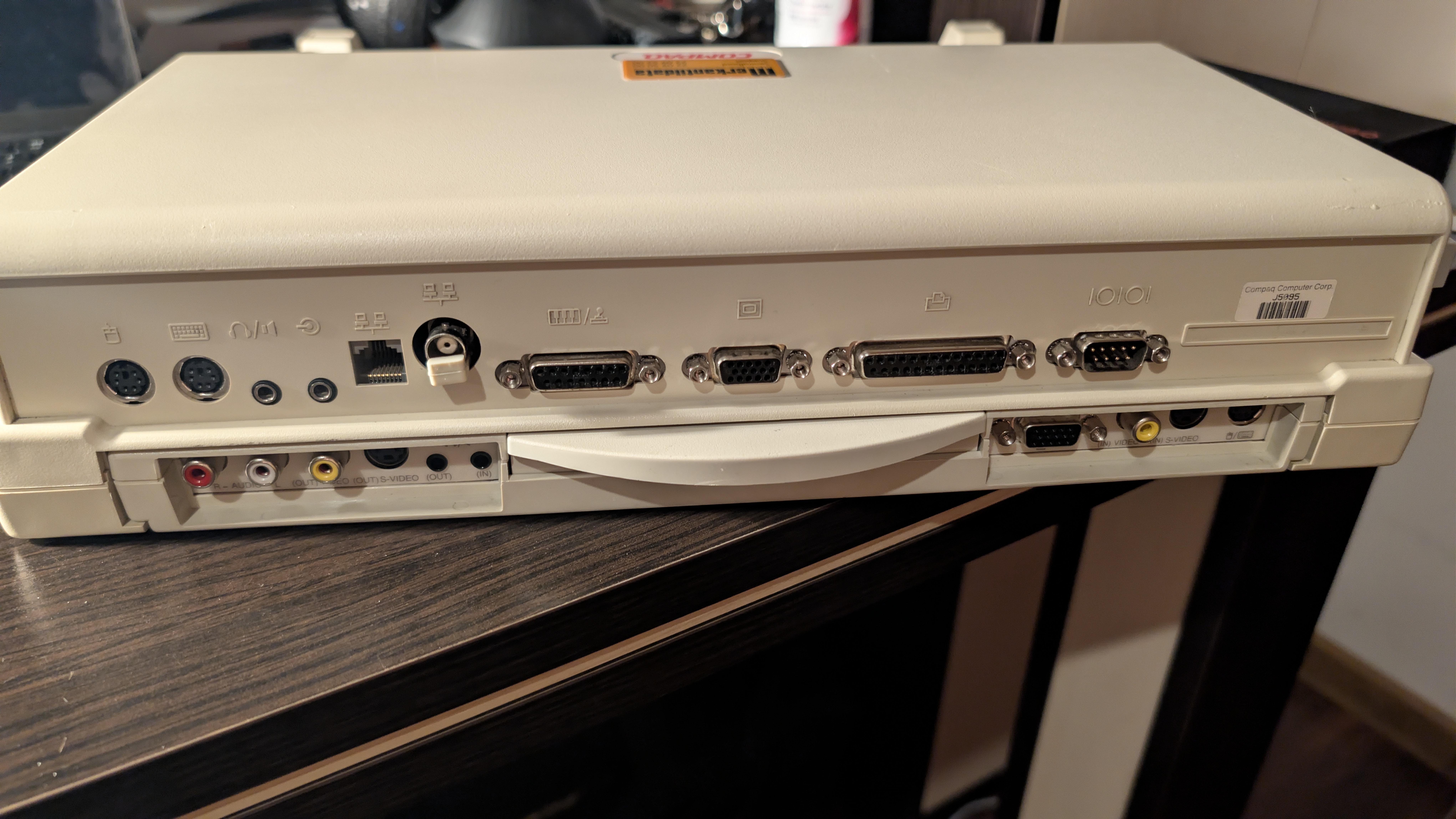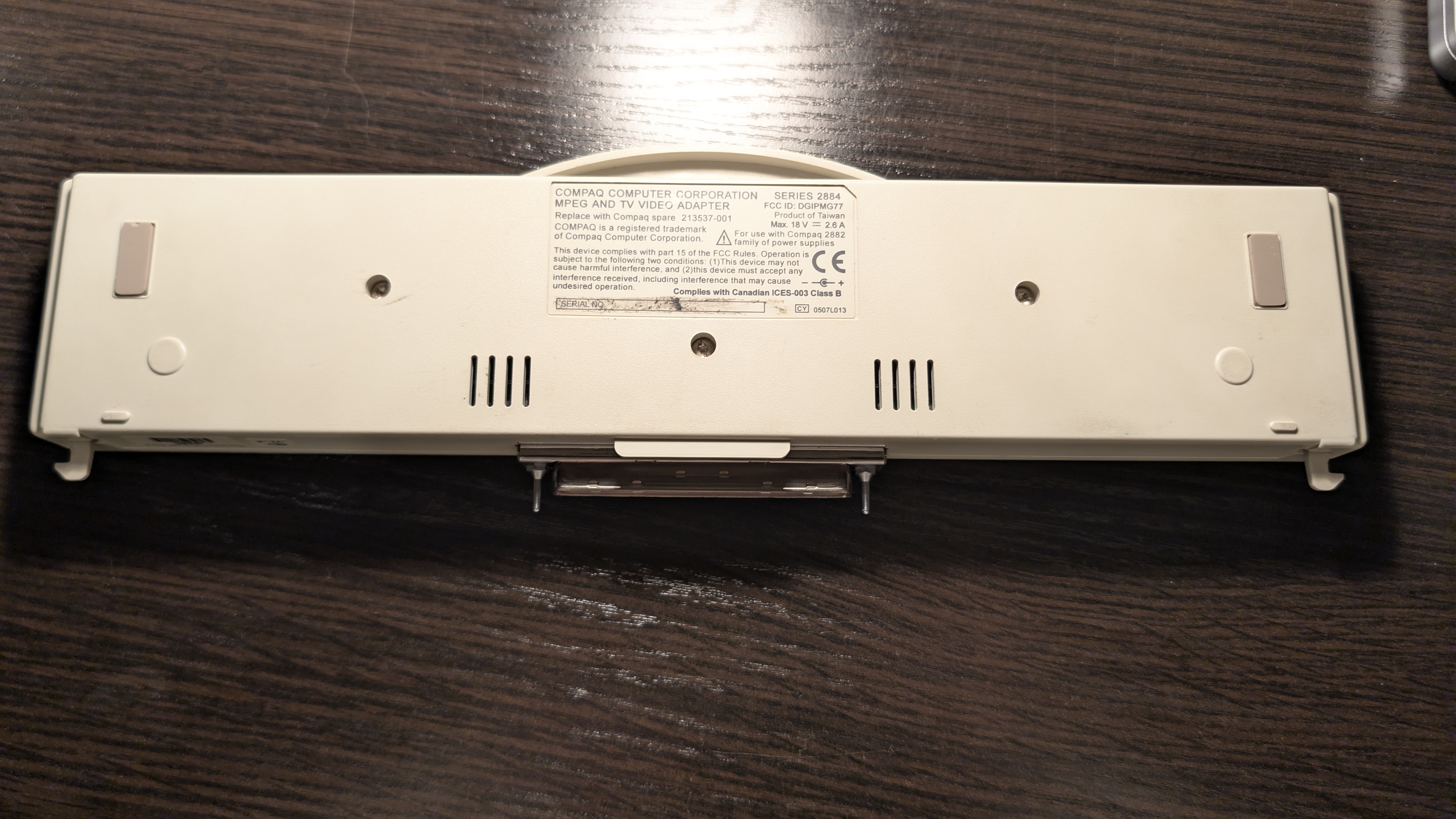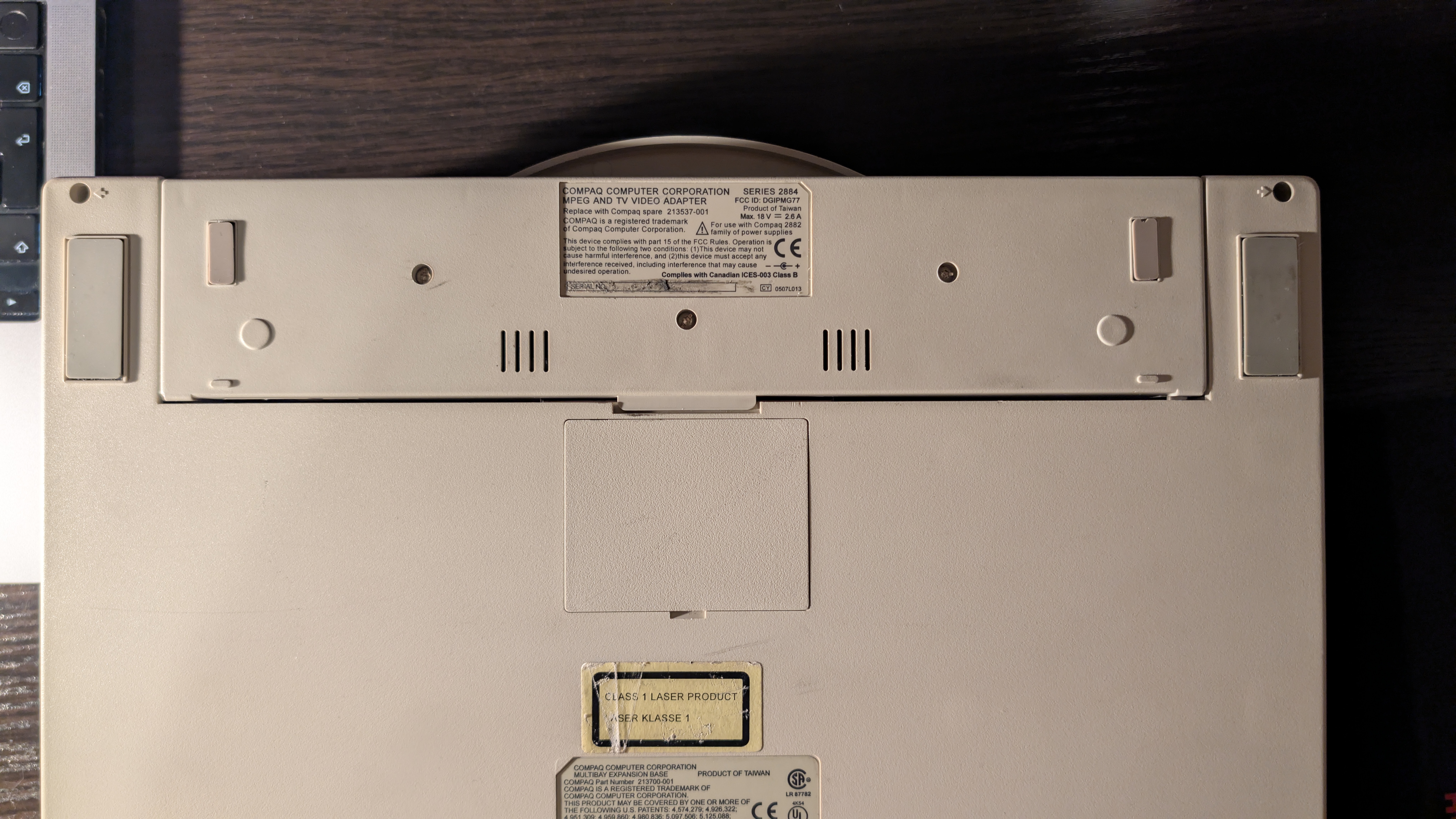 There’s a Compaq logo at the top and a sticker on the bottom. We can learn it’s powered by 18V (up to 2.6A). It has a power port on the side (positive inside, negative outside), but once the adapter is plugged into a docking station there’s no way to use it, which I assume means it may work standalone? 🤔 In the manual we can find a mention of MPEG AC Adapter (part number 241909-001, page 95-97, Chapter 3.9 Computer Optional Accessories), but this may be even harder to find than the mpeg adapter itself.