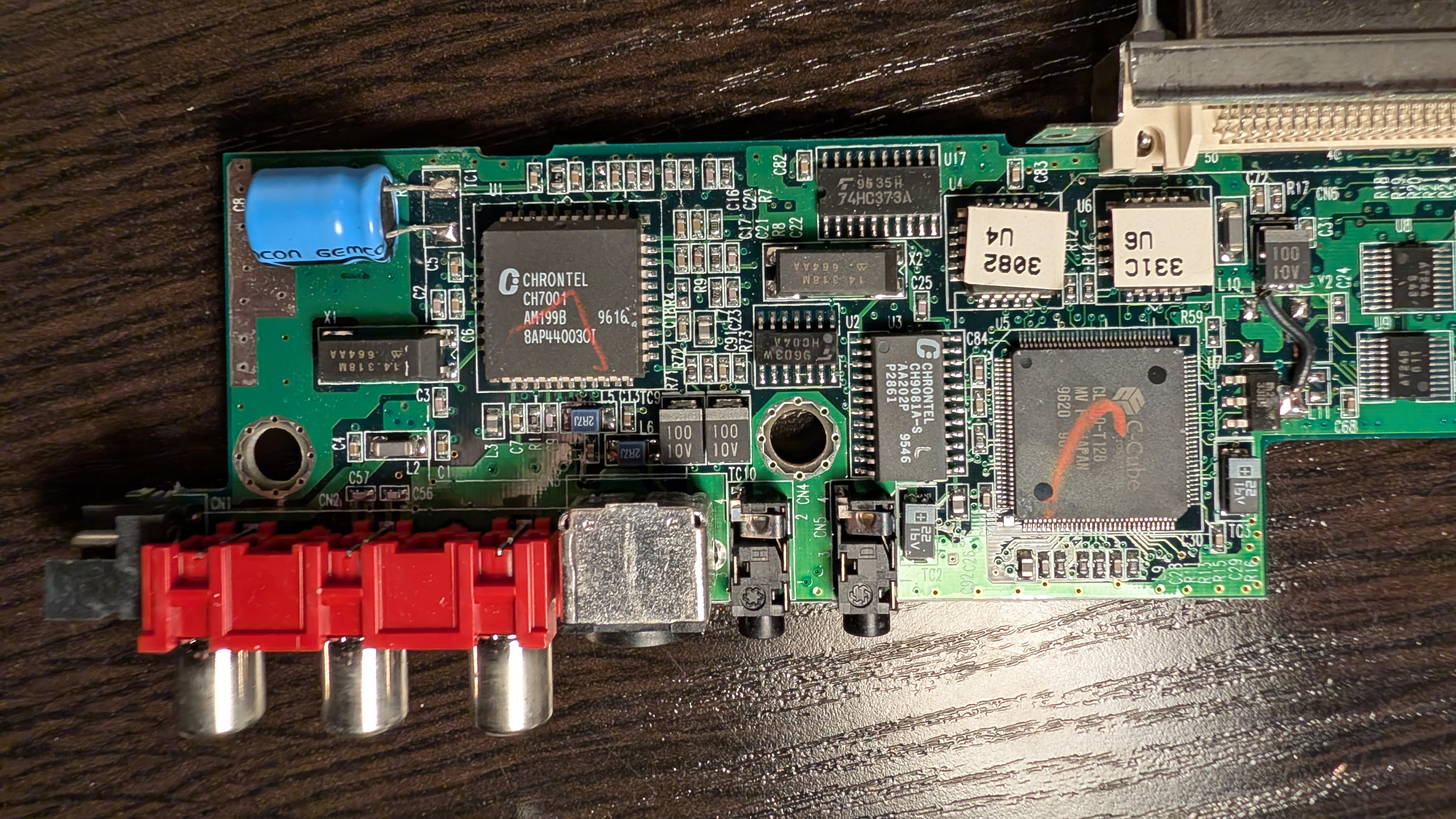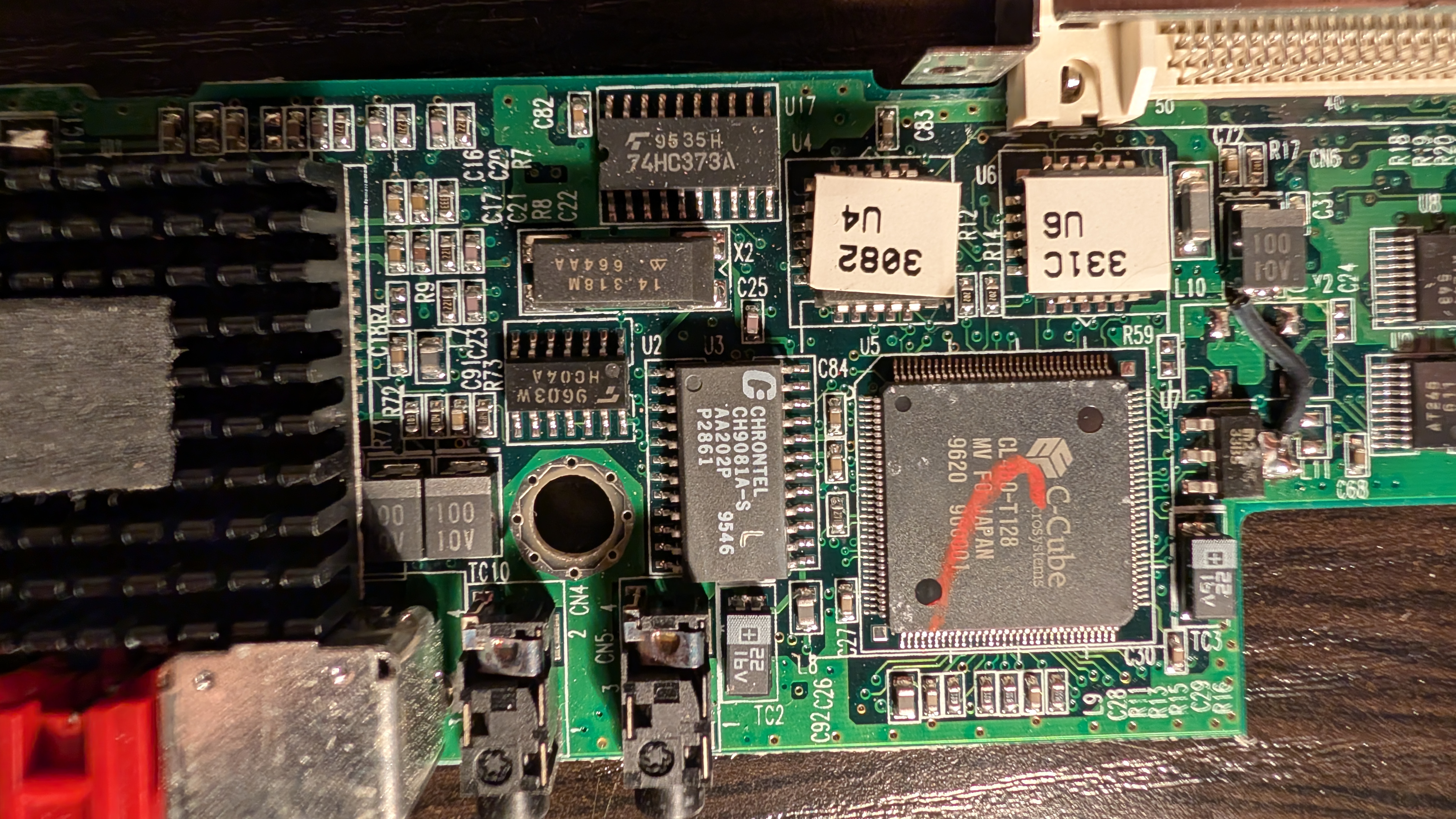 - C-Cube CL-480-T128 MV FO JAPAN 9620 - possibly the mpeg codec decode chip made by C-Cube Microsystems (later known as LSI Logic and then Broadcom). 9620 is likely date code indicating 20th week of 1996 (May 13-19th)