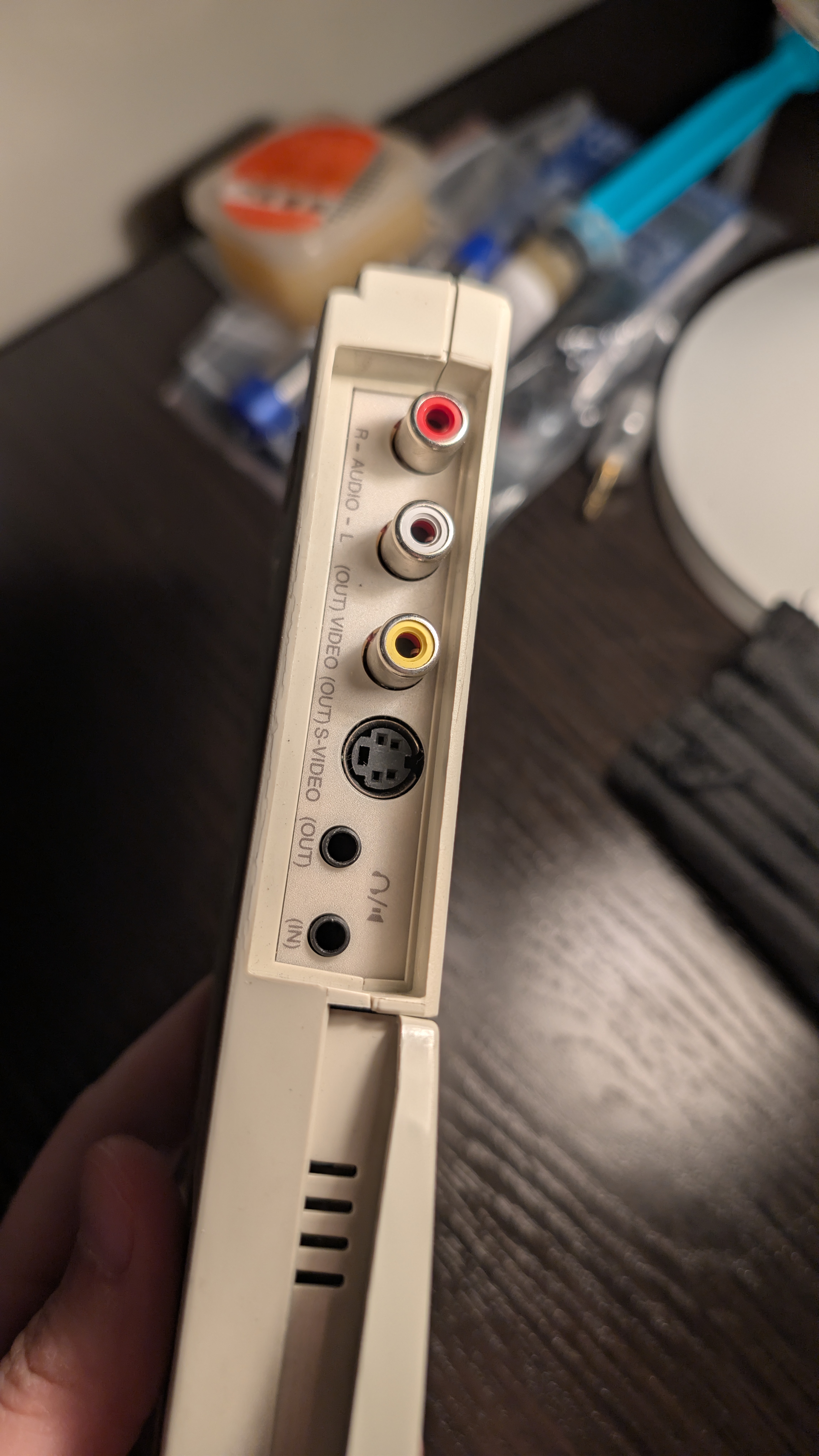 What’s on the back of the adapter? It has a few out ports on the left like composite, S-Video, plus two jacks, in and out. On the right side there’s the VGA port for external monitor, video and S-Video inputs and a keyboard or mouse PS2 port.